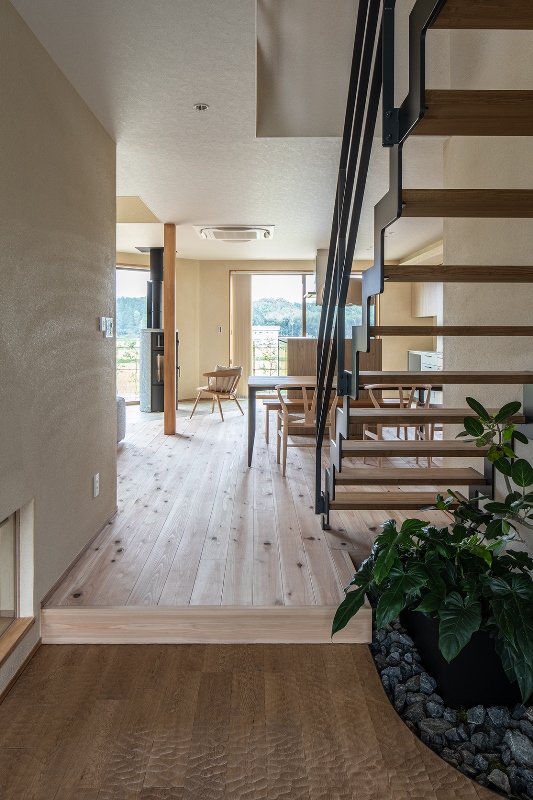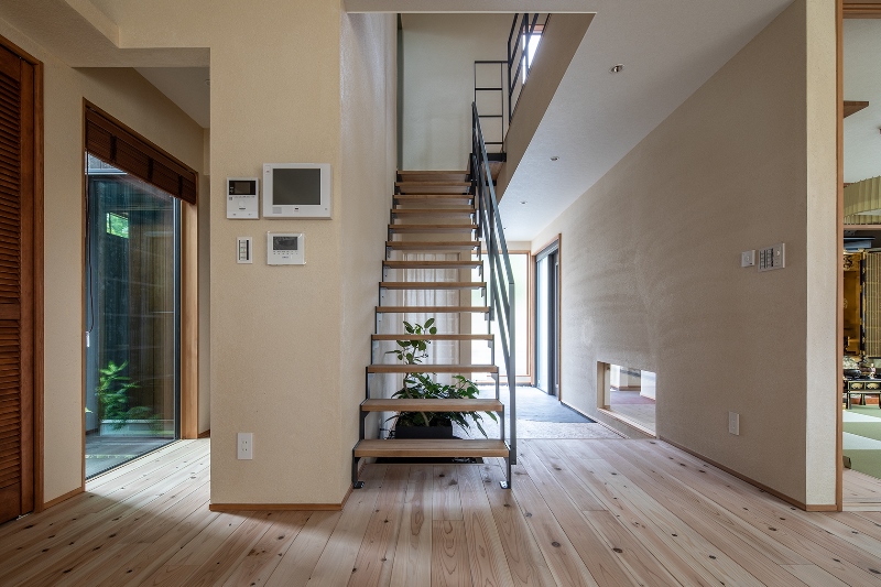 内装には無垢フローリングに柿渋塗装、瀬戸漆喰の塗り壁など自然素材をふんだんに使ったお家になります。