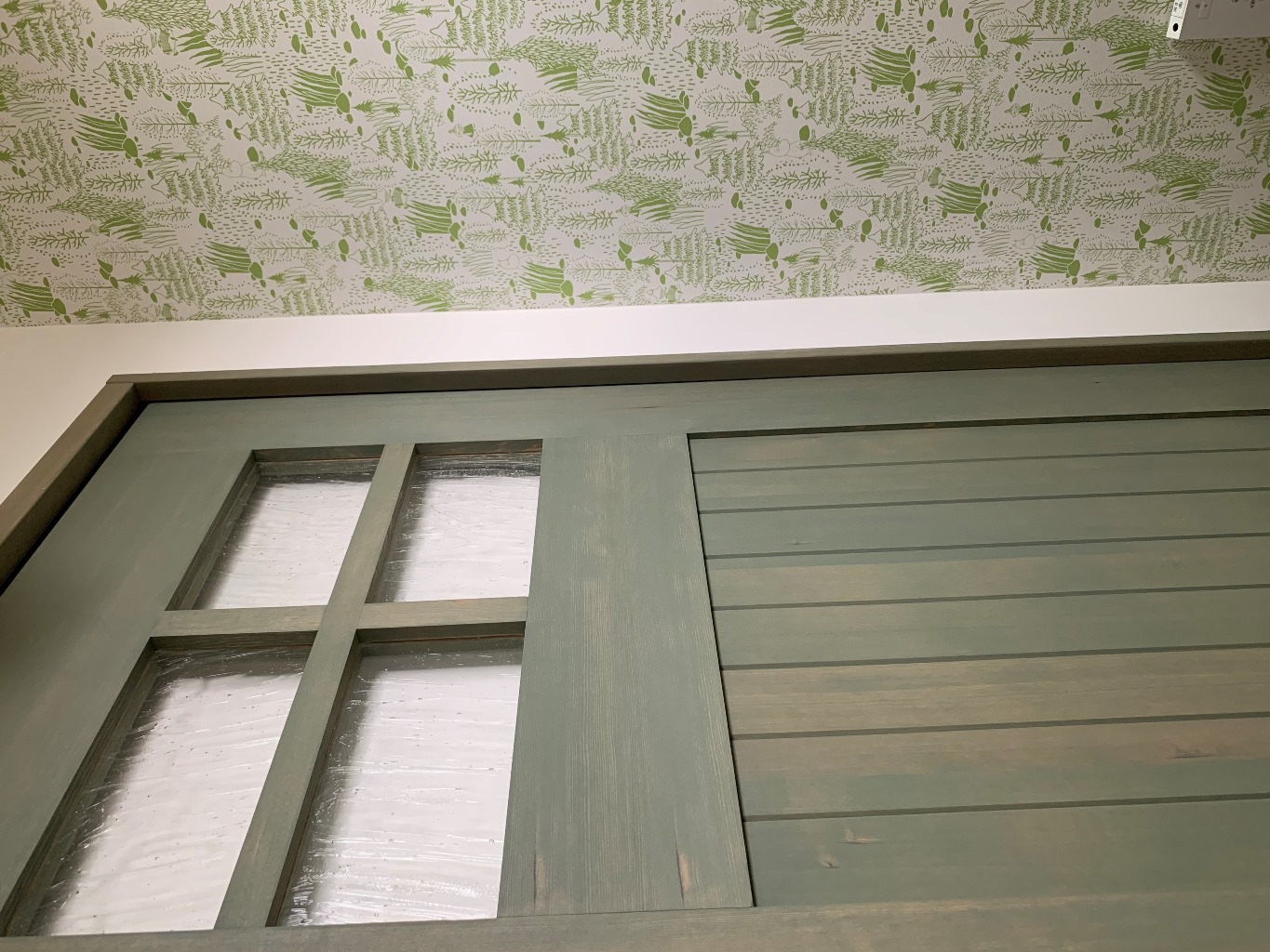 淡いグリーンで揃えたトイレのドアと壁紙。