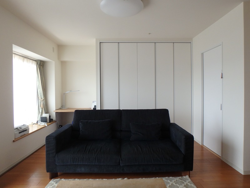 ソファーの背面に天井までのクローゼットを新設し、