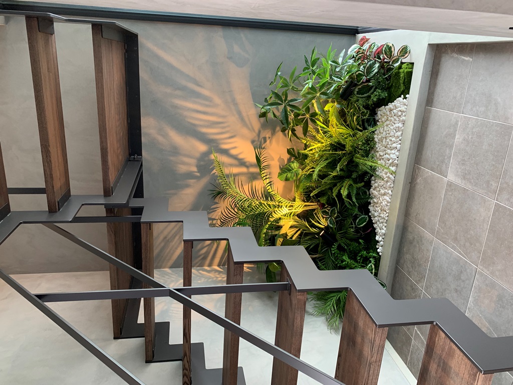 階段下にグリーンを飾り、空間が華やかに。