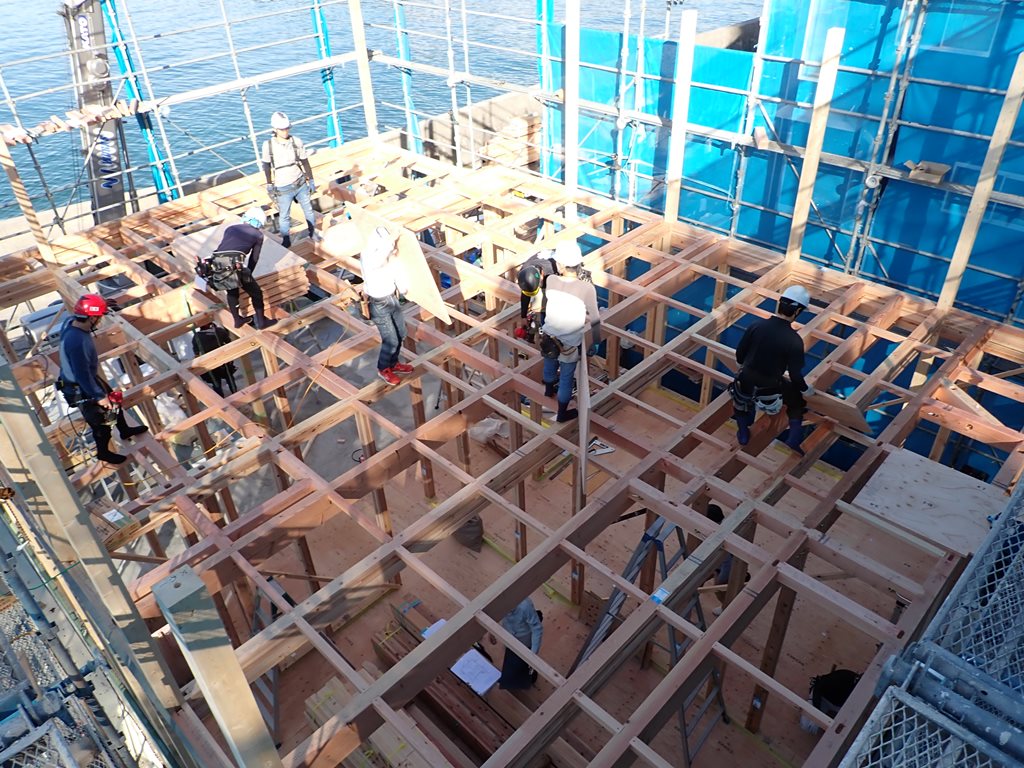 8時にスタートし、9時半ごろには2階の床が組まれました。