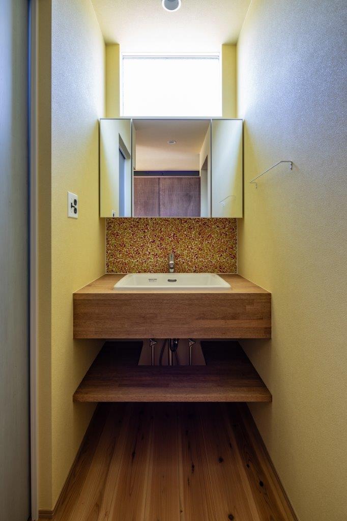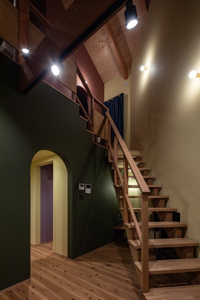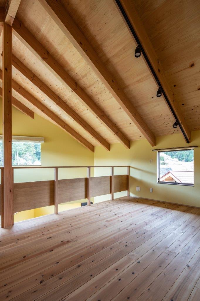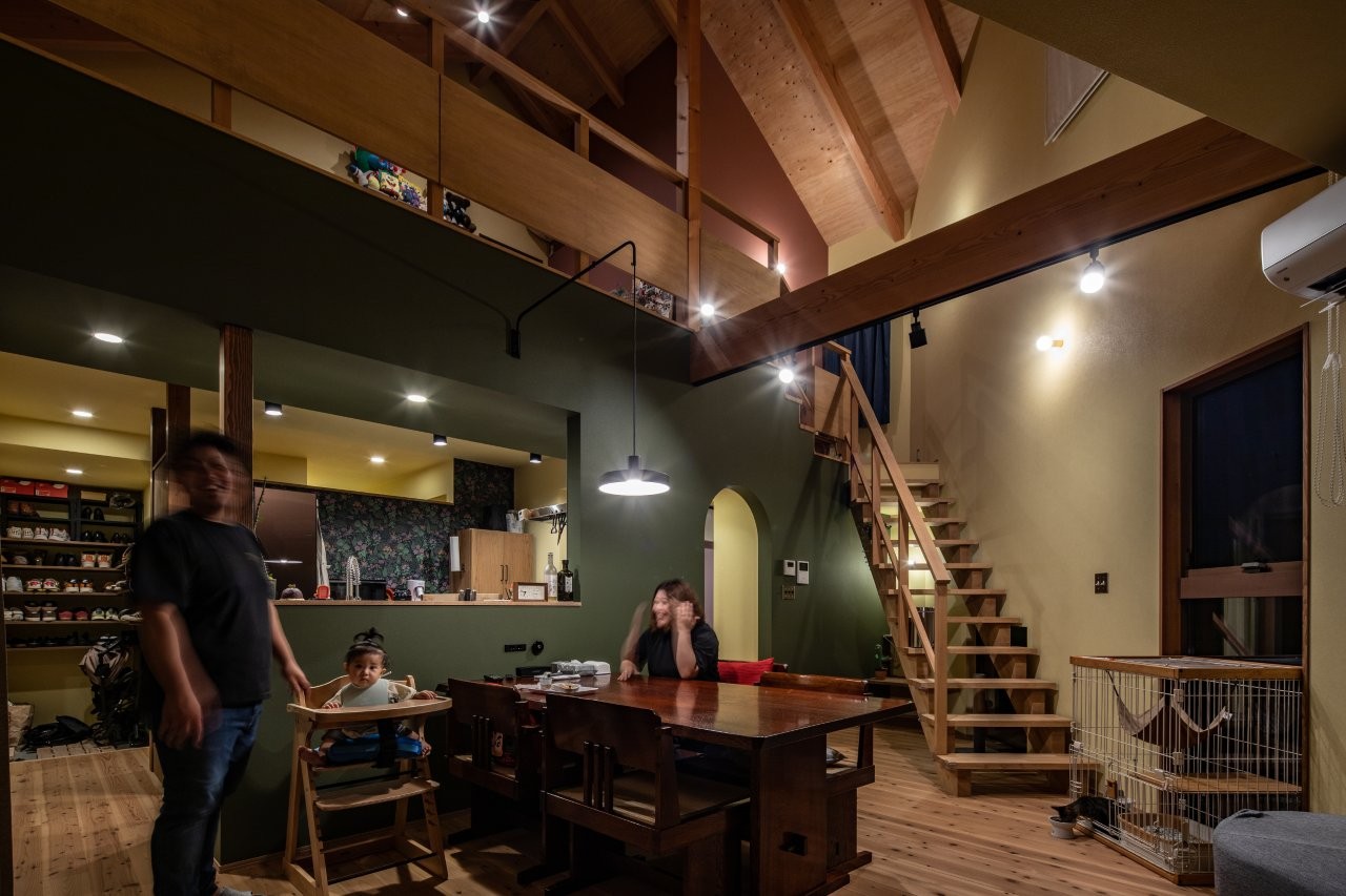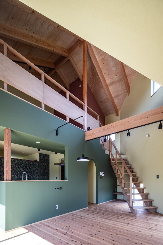 フローリングは杉無垢で、構造をあらわしにした天井とアースカラーの壁紙が、カラフルながら落ち着いた空間に仕上げています。