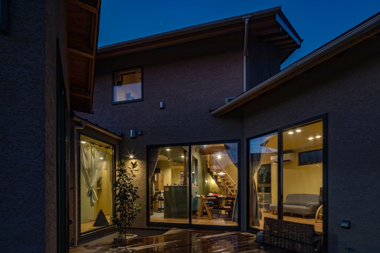 吹抜けの高窓や中庭の大開口からたくさん自然光が入る、明るく気持ちのいい家が完成しました。
